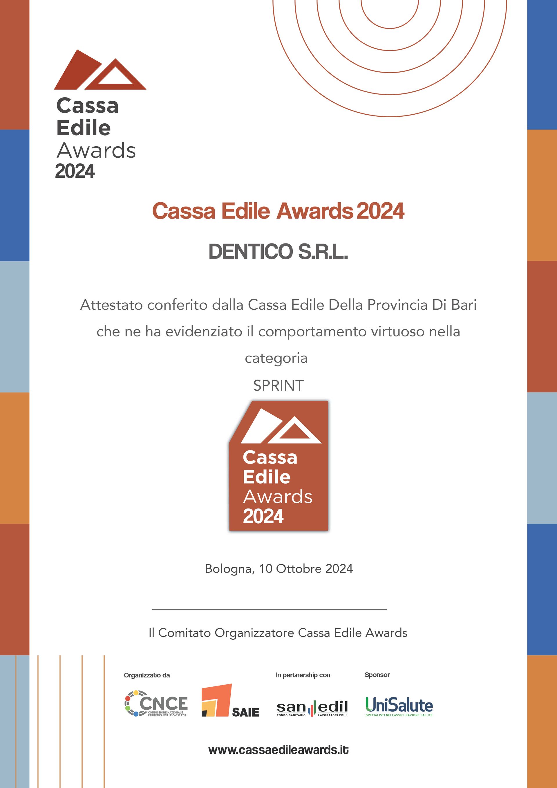 Nel 2024, l'Autorità Garante della Concorrenza e del Mercato ha conferito alla Dentico Srl un importante riconoscimento, attribuendole le 2 stellette nel Rating di Legalità, un traguardo che testimonia il suo impegno per la trasparenza e la correttezza aziendale. Contestualmente, la Cassa Edile di Bari ha deciso di rinnovare il premio nella prestigiosa categoria Sprint durante l'edizione annuale dei Cassa Edile Awards, sottolineando così la continua distinzione e l'eccellenza della Dentico Srl nel settore. Questo duplice riconoscimento evidenzia non solo la qualità del lavoro svolto dall'azienda, ma anche il suo contributo significativo al mercato locale e alla comunità.