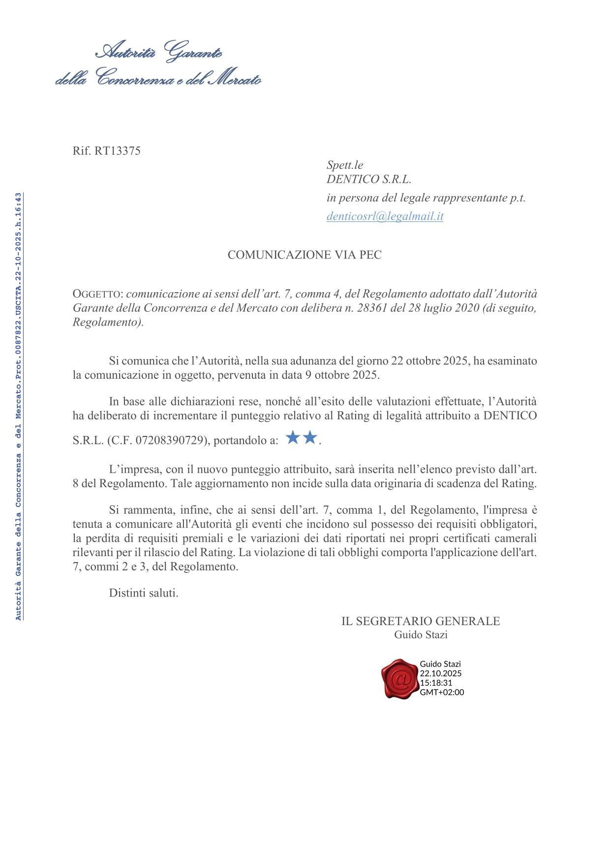 Nel 2025, l'Autorità Garante della Concorrenza e del Mercato ha conferito alla Dentico Srl un importante riconoscimento, attribuendole le 2 stellette nel Rating di Legalità, un traguardo che testimonia il suo impegno per la trasparenza e la correttezza aziendale. Contestualmente, la Cassa Edile di Bari ha deciso di rinnovare il premio nella prestigiosa categoria Sprint durante l'edizione annuale dei Cassa Edile Awards, sottolineando così la continua distinzione e l'eccellenza della Dentico Srl nel settore. Questo duplice riconoscimento evidenzia non solo la qualità del lavoro svolto dall'azienda, ma anche il suo contributo significativo al mercato locale e alla comunità.